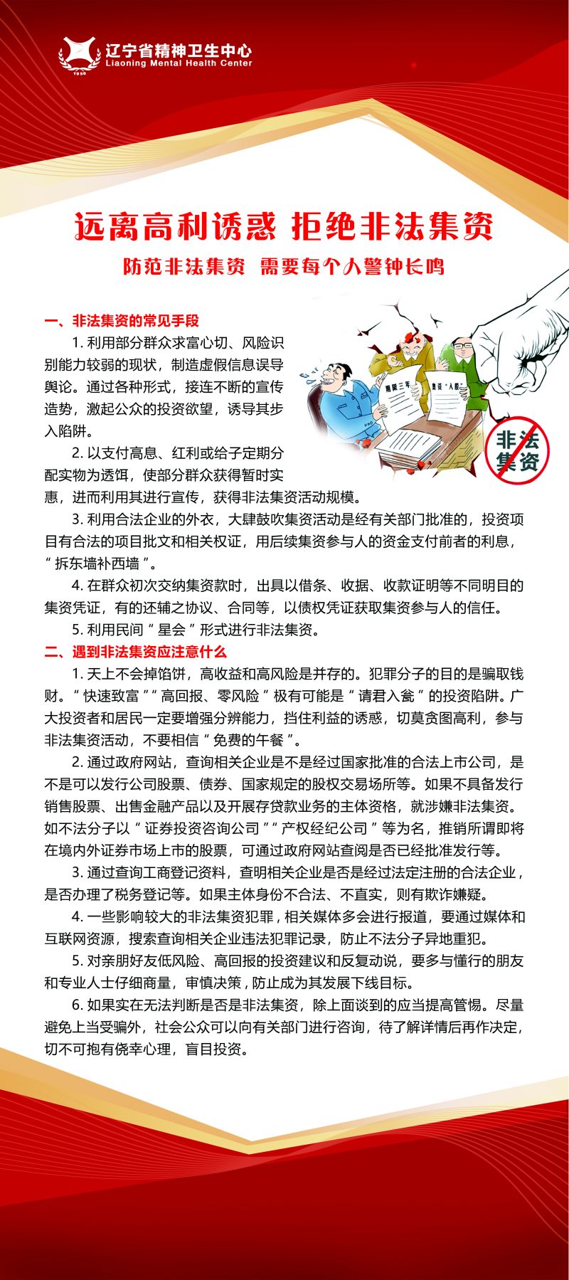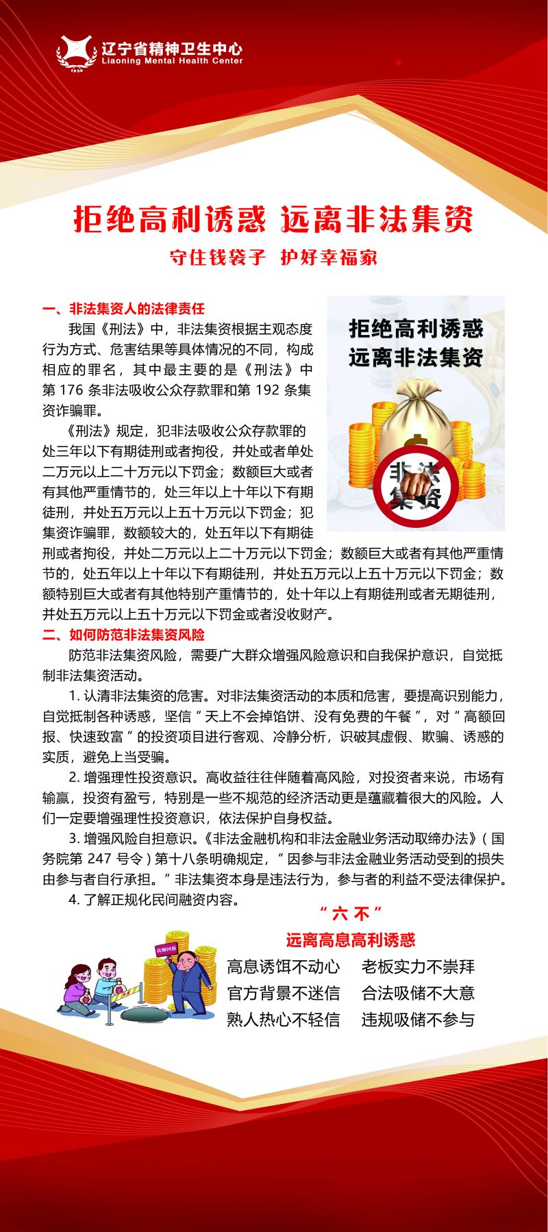 6月是全国防范非法集资宣传月,6月15日是防范非法集资集中宣传日,辽宁省精神卫生中心紧紧围绕“守住钱袋子 护好幸福家”为主题开展了防范非法集资宣传月活动。